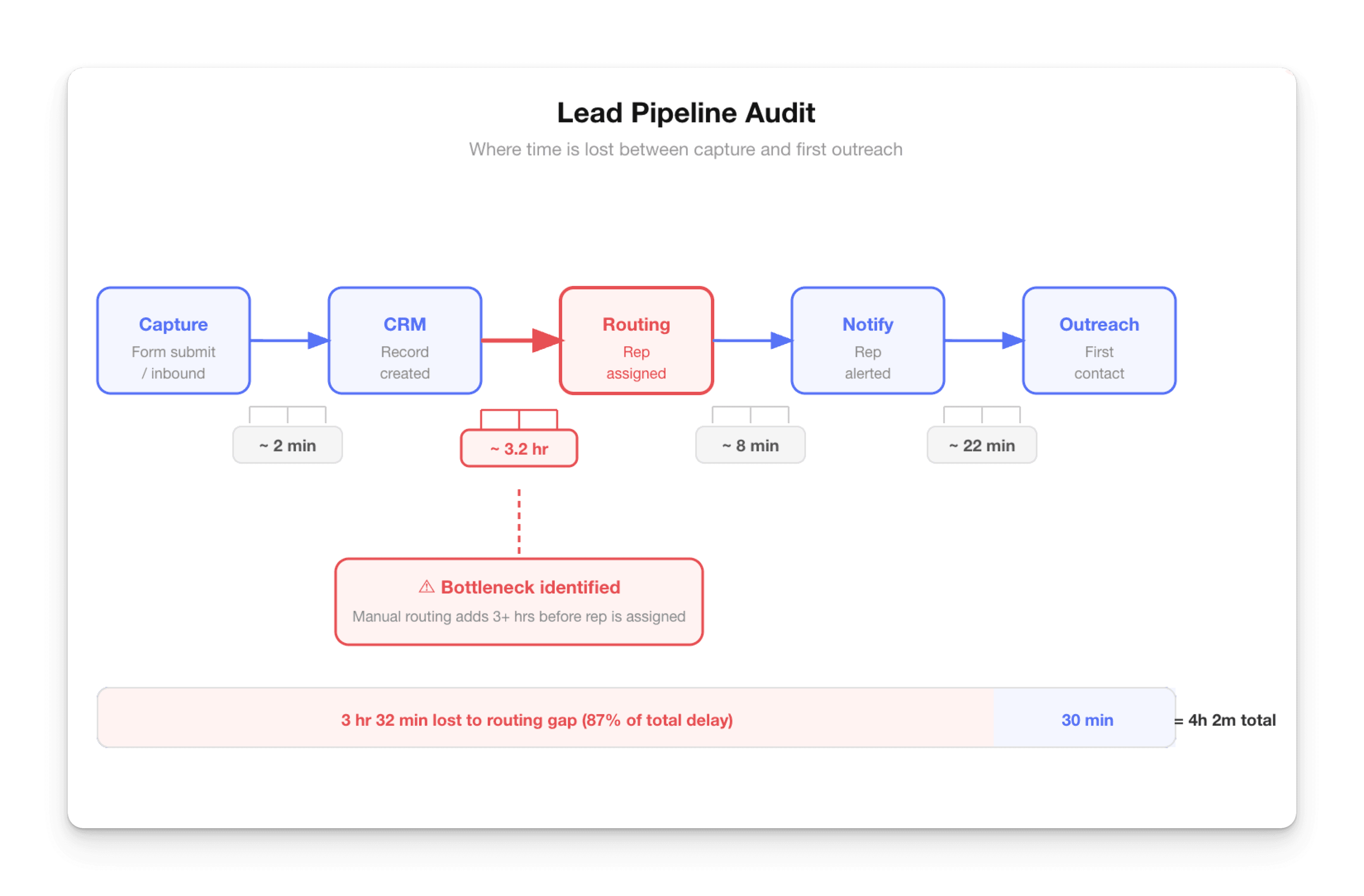 Most teams can't do this because the flow was never designed. It evolved — one tool at a time, one integration at a time, one "quick fix" at a time. The audit exists to make the invisible visible, so you can find where leads are leaking and fix the right things in the right order.
