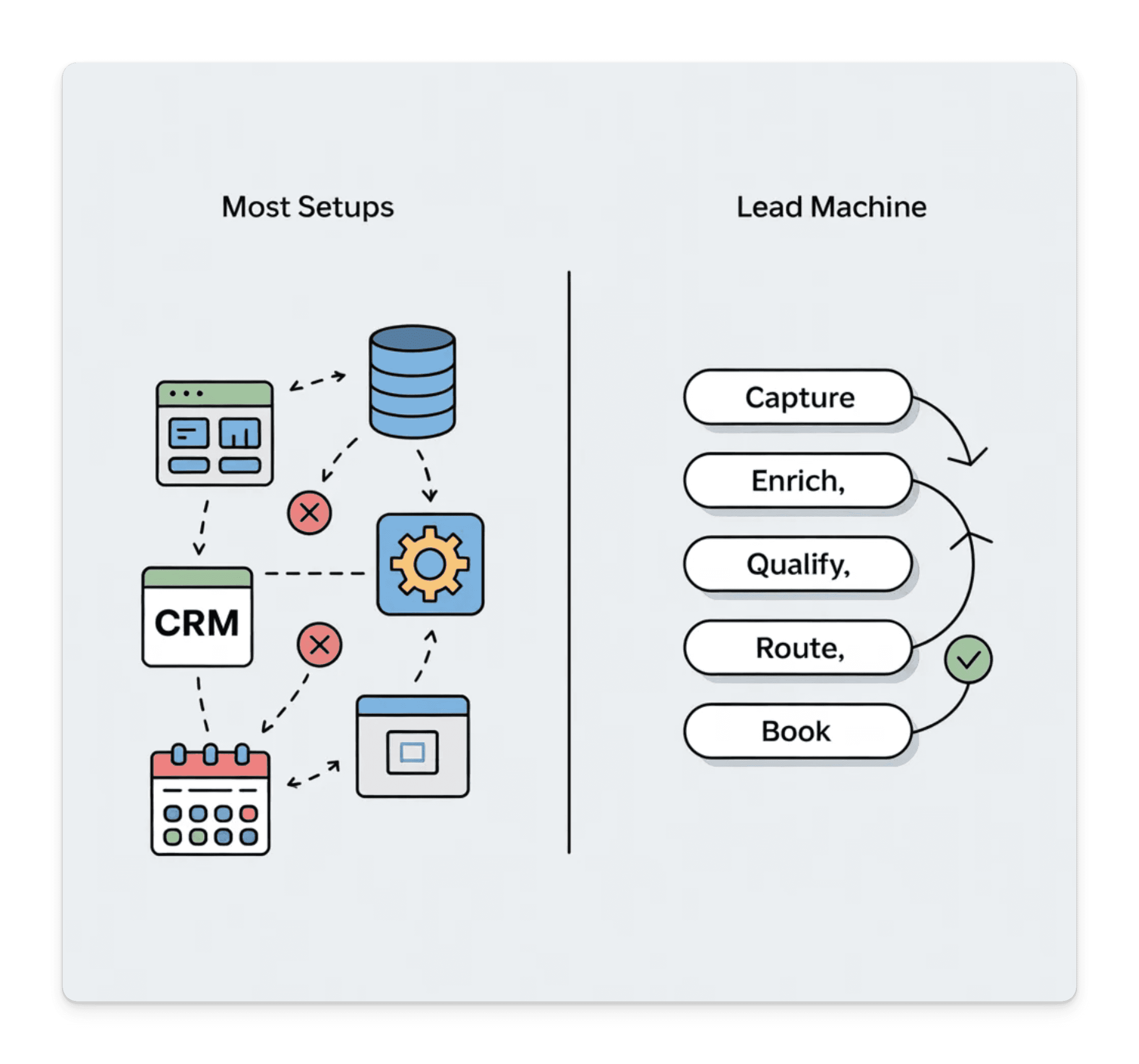 A real lead machine doesn't have leaks. It captures, qualifies, enriches, routes, and books meetings — without anyone touching it. The output is booked meetings on the right rep's calendar. The input is traffic. Everything in between is automated.