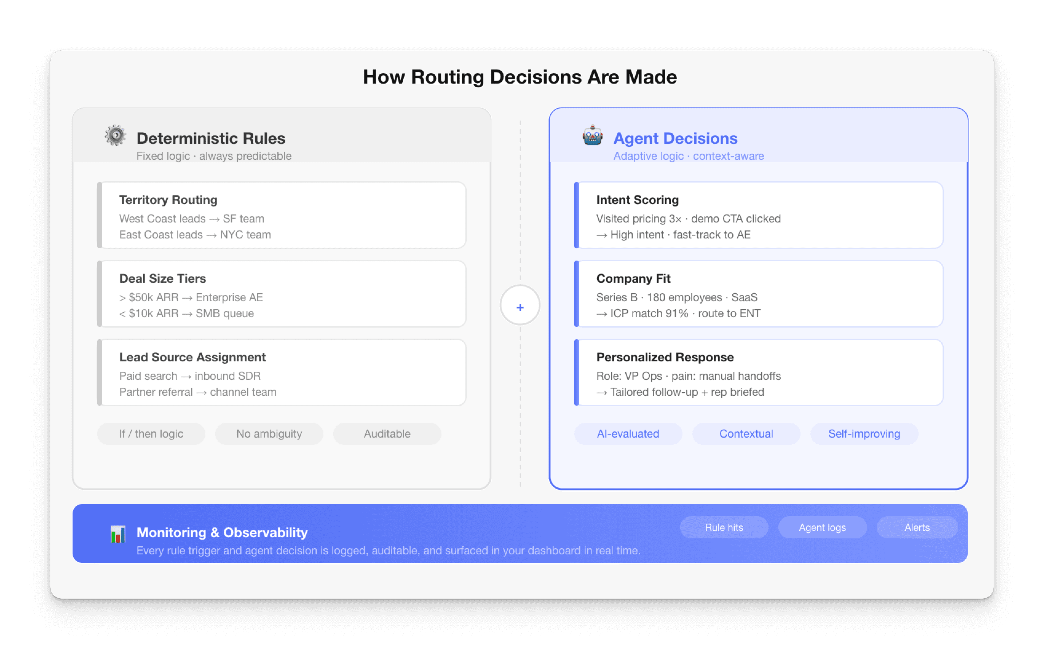 Use deterministic rules when the logic is clear and stable. If a lead from zip code 78701 should always go to Rep A, that's a rule. If leads under $10K ARR should route to the SMB team, that's a rule. Rules are fast, transparent, auditable, and they don't hallucinate.