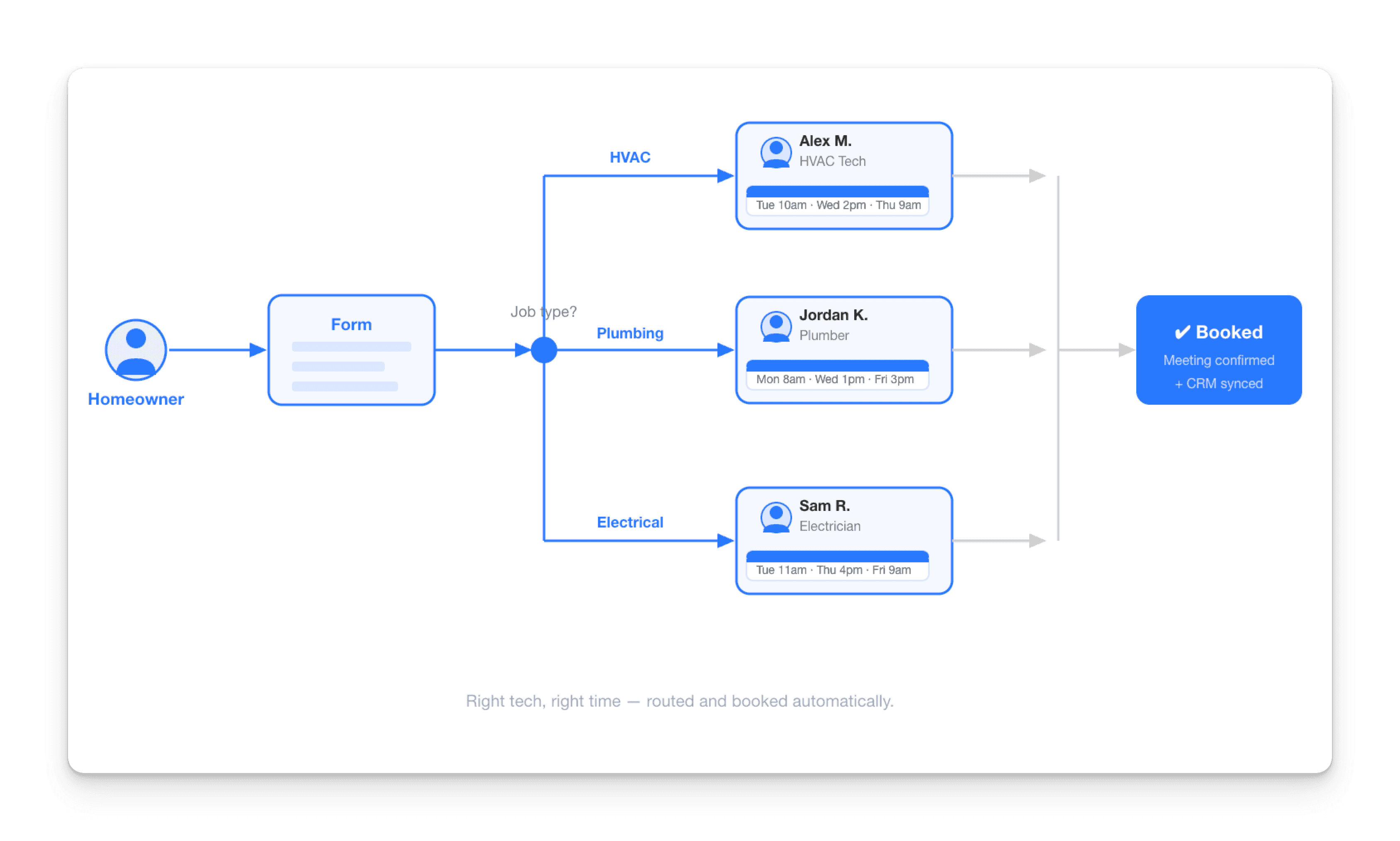 Real-time availability and booking. The right technician's calendar shows up inside the form based on the homeowner's location and service need. They book on the spot. No callback required.