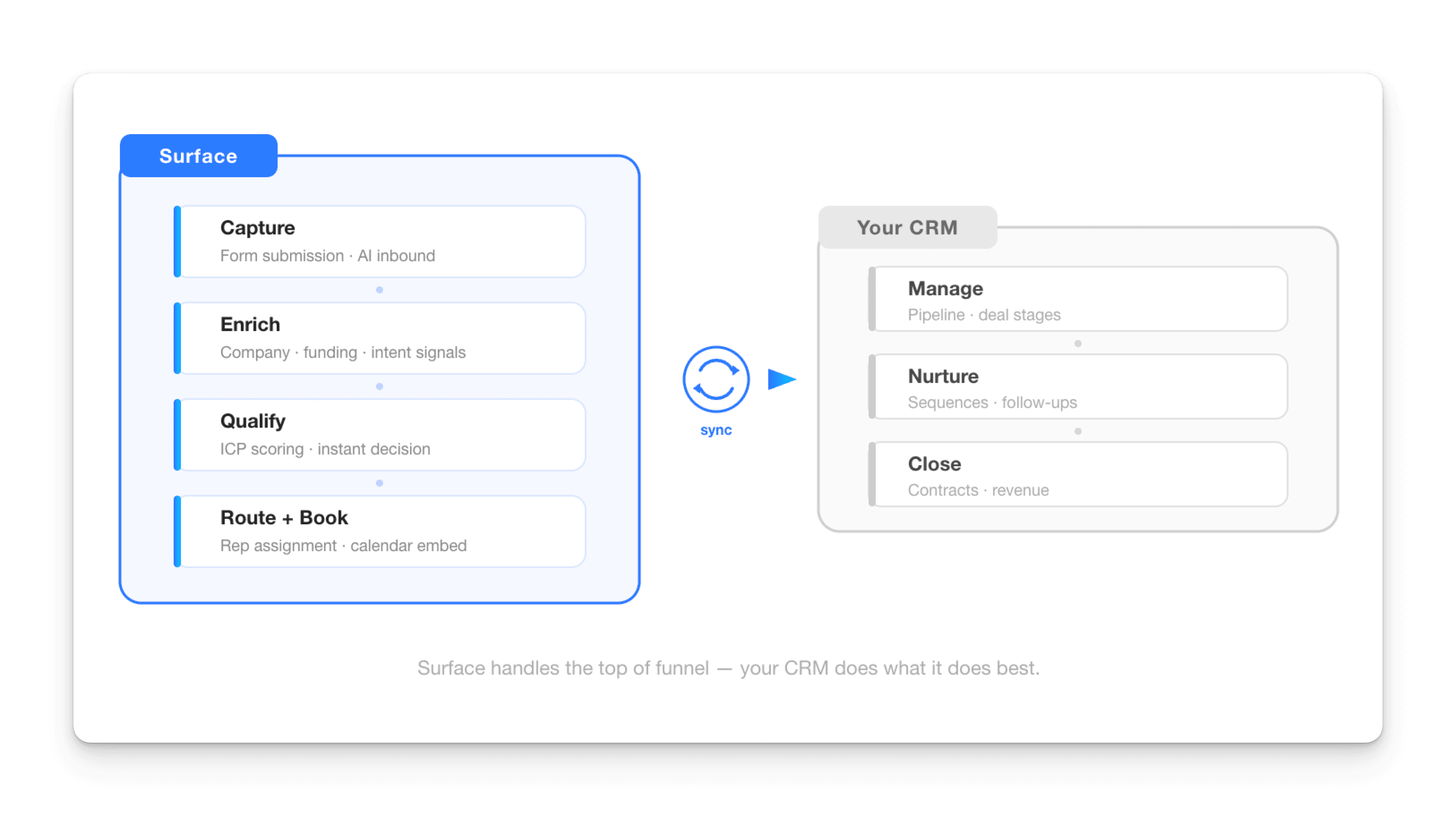 Surface is the layer that sits between your form and your CRM. It makes sure the lead that arrives in your CRM is enriched, qualified, scored, routed to the right rep, and already has a meeting booked.